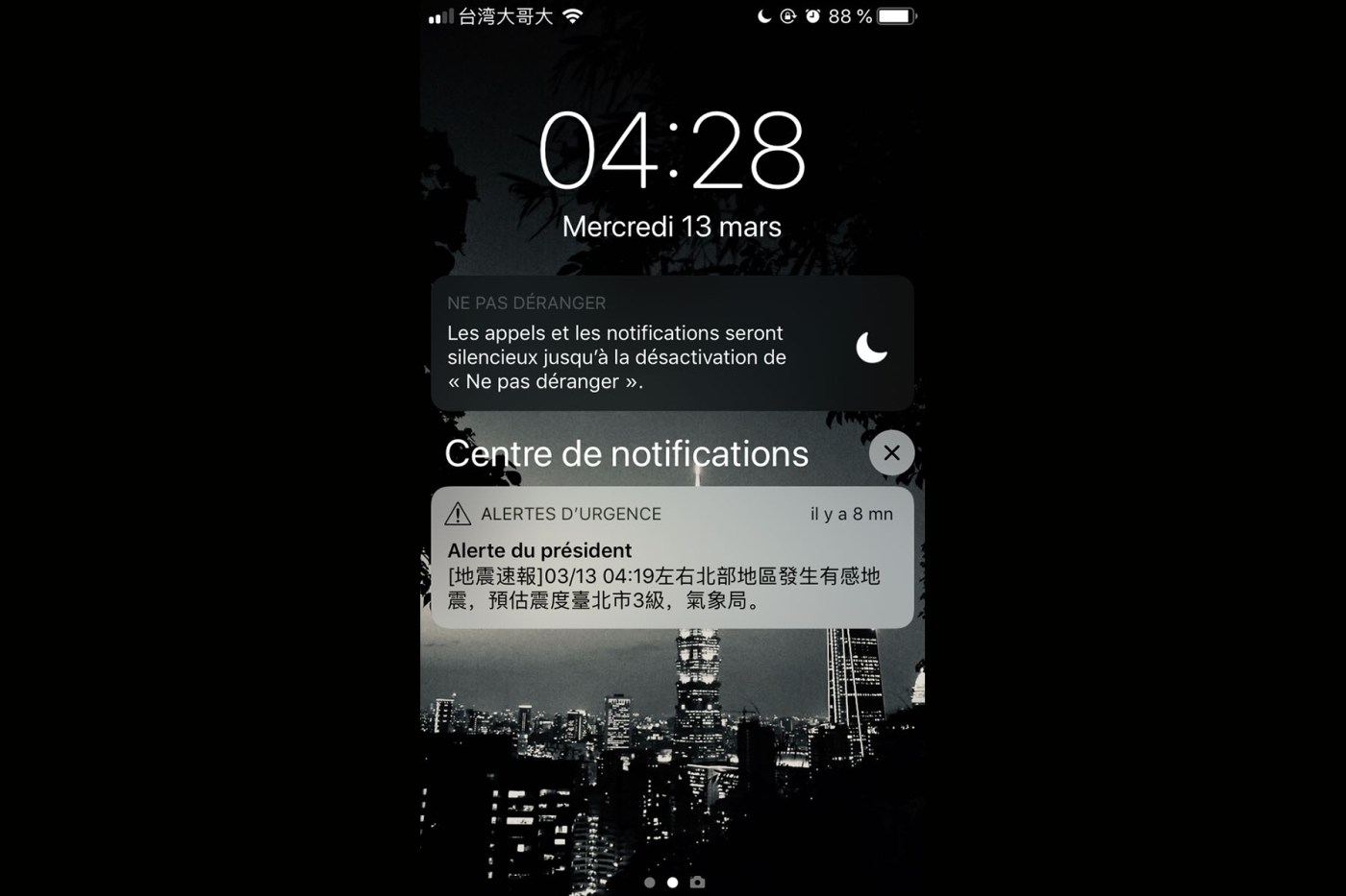 Nous n’avons pas tout de suite compris qu’il s’agissait d’un tremblement de terre d’ailleurs. Il était 4h20 du matin, nous étions réveillés à ce moment là mais en train d’essayer de nous endormir (Les moustiques nous réveillent souvent, les bougres) quand soudain ! : Le lit bouge un peu, j’ai tout d’abord pensé que c’était Zak qui le faisait bouger donc je n’ai rien dit, puis Zak me demande “ça vient de bouger nan ?” Alors j’ai dit “Bah oui, c’était pas toi ?”, je croyais qu’il me faisait encore une blague mais tout à coup mon téléphone se mit à vibrer… Alors que j’étais en silencieux et que je n’avais mis aucun réveil à 4h20 évidement. Je regarde mon téléphone et je vois ça :