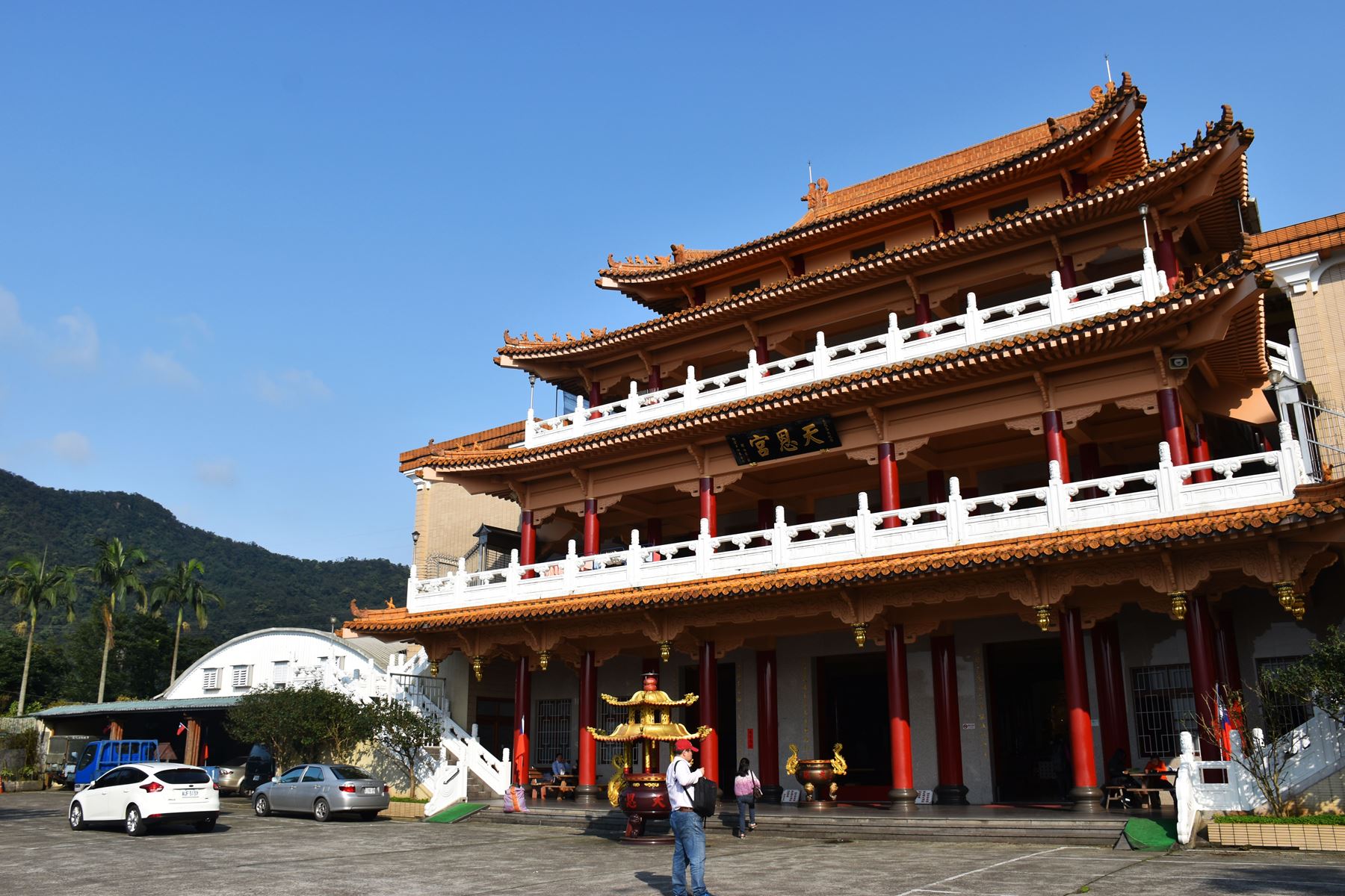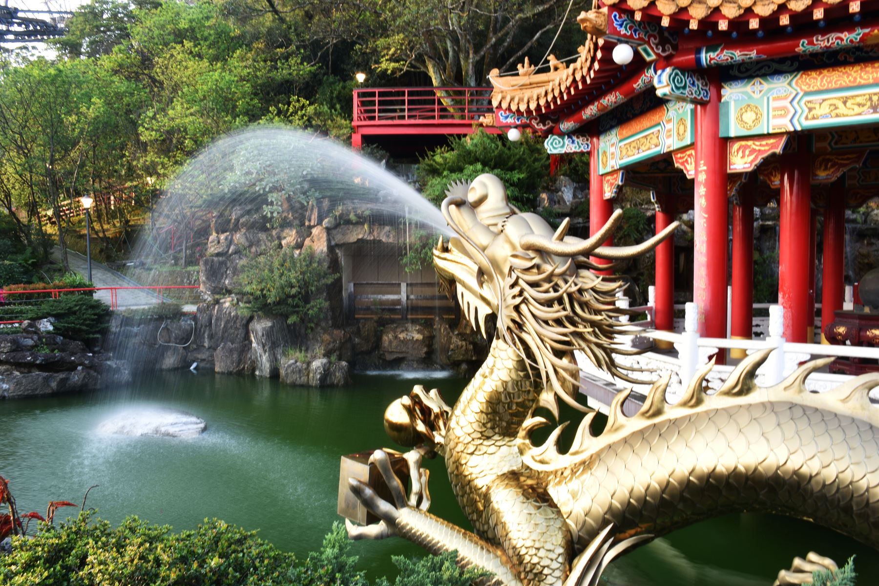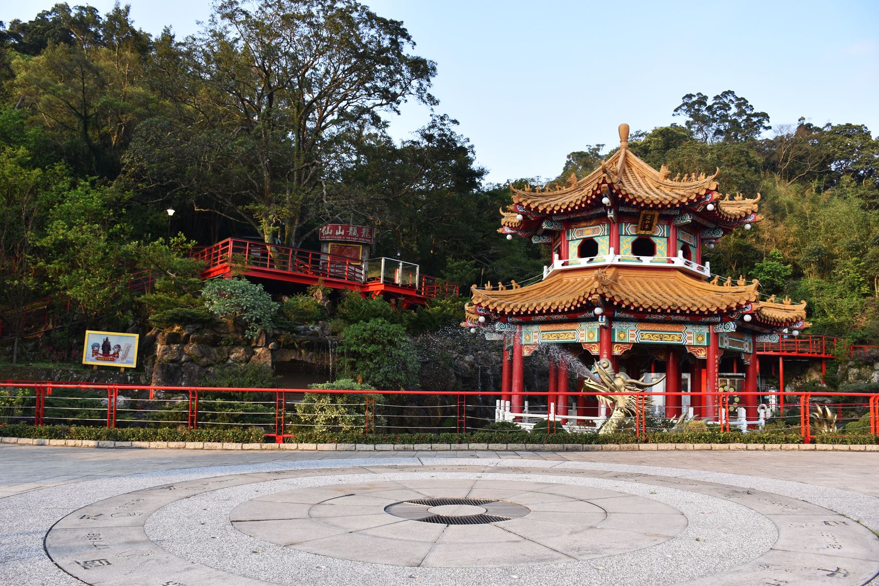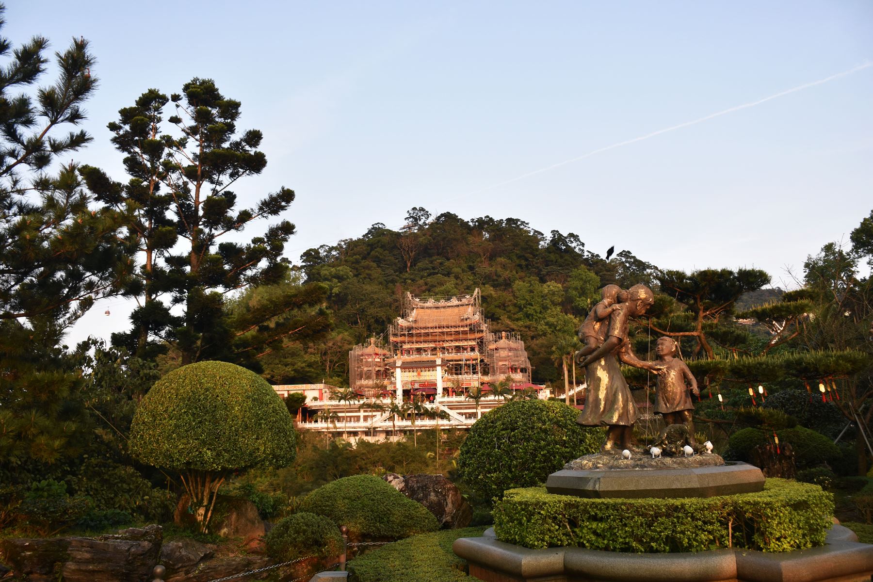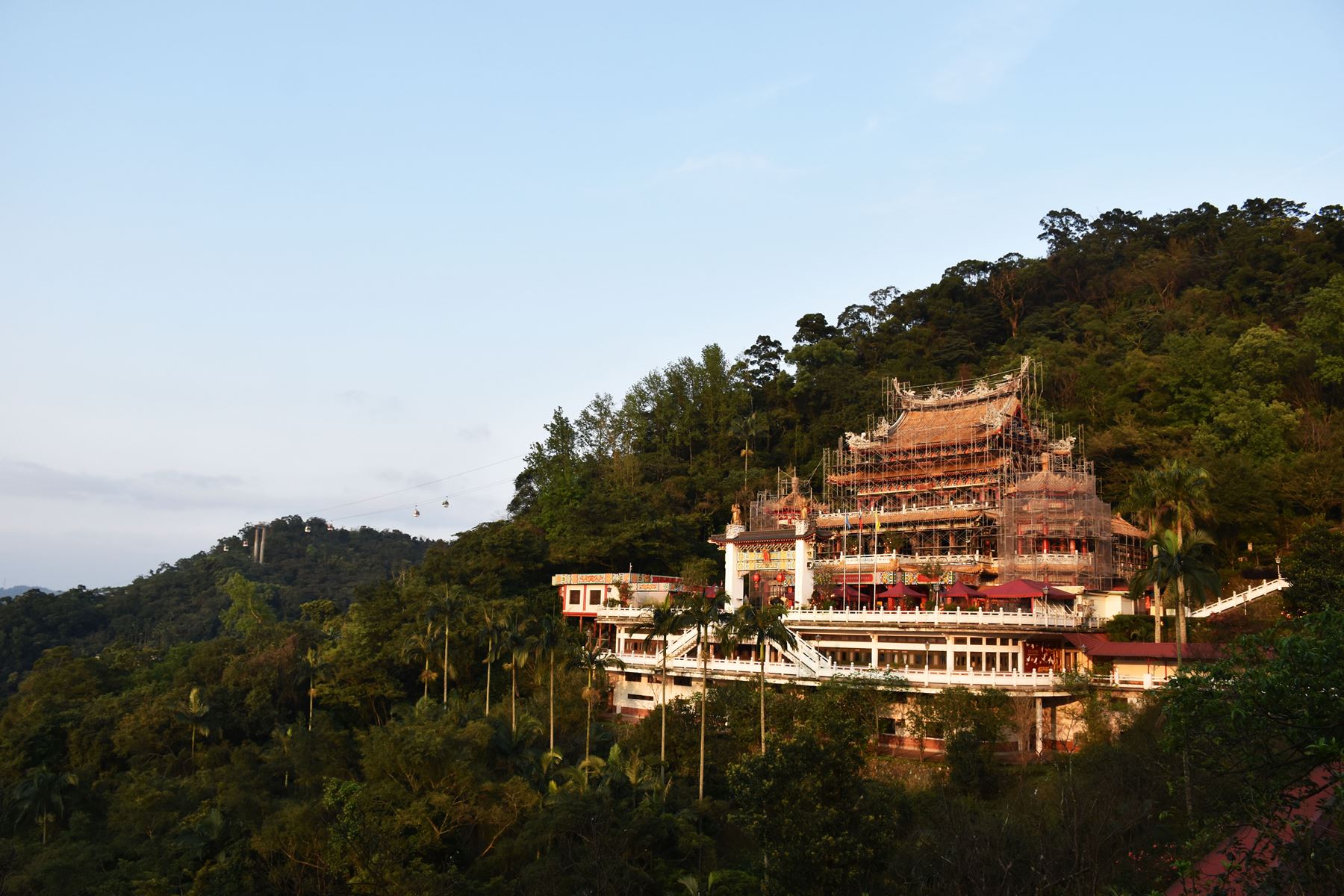 Après un bon moment de marche nous voilà arrivés à l’arrêt du temple, nous prenons quelques photos de l’endroit (qui est assez sympa) puis nous nous empressons d’aller voir le temple qui, de loin, nous avait semblé plutôt cool ! Mais pas de chance… Il était aussi en rénovation… On les cumule en ce moment. Malgré les échafaudages le temple est assez imposant et classe (ce qui nous fait encore plus regretter de ne pas l’avoir vu dans son état normal). Un peu plus bas sur le chemin qui mène au temple il y avait un petit parc assez paisible, nous nous y sommes donc arrêté quelques temps avant de repartir prendre une cabine pour redescendre.